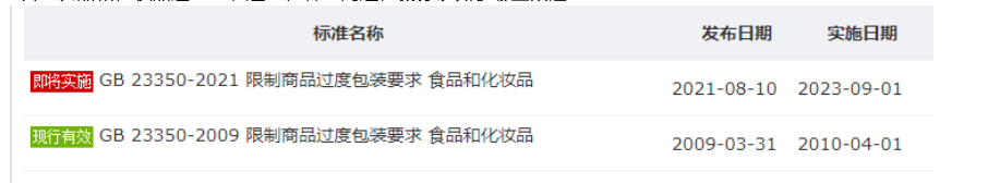 《GB 23350-2021限制商品过度包装要求 食品和化妆品》于2021年8月10日发布,将于2023年9月1日实施。