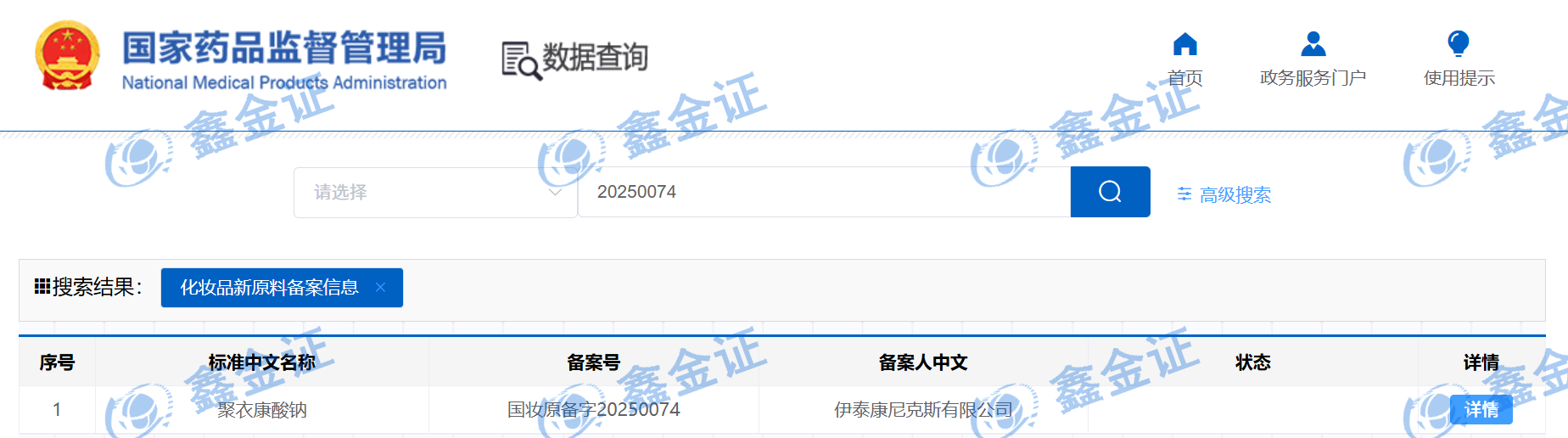 [北京鑫金证] 全体员工怀着无比激动与自豪的心情,向业界同仁与合作伙伴郑重宣布:我们成功助力战略合作伙伴 [云南英格生物技术有限公司] 的创新原料 “[粗茎秦艽(GENTIANA CRASSICAULIS)根提取物]”[伊泰康尼克斯有限公司] 的创新原料 “[聚衣康酸钠]” 双双 通过国家药品监督管理局(NMPA)化妆品新原料备案(备案号分别为:[国妆原备字20250071]、[国妆原备字20250074])!