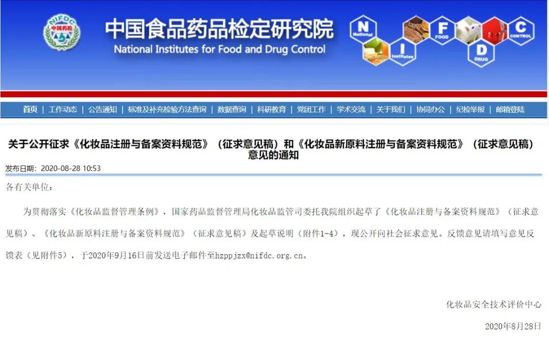 8月28日,中国食品药品检定研究院发布关于公开征求《化妆品注册与备案资料规范》(征求意见稿)和《化妆品新原料注册与备案资料规范》(征求意见稿)意见的通知。