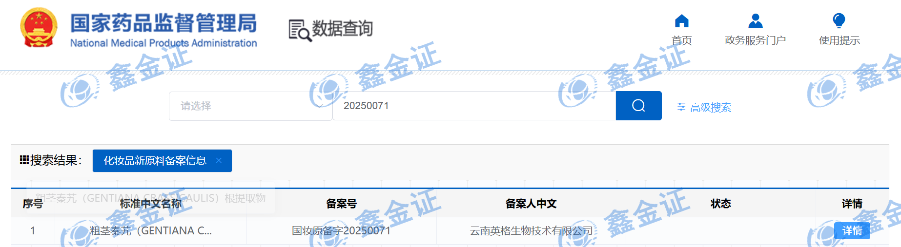 [北京鑫金证] 全体员工怀着无比激动与自豪的心情,向业界同仁与合作伙伴郑重宣布:我们成功助力战略合作伙伴 [云南英格生物技术有限公司] 的创新原料 “[粗茎秦艽(GENTIANA CRASSICAULIS)根提取物]”[伊泰康尼克斯有限公司] 的创新原料 “[聚衣康酸钠]” 双双 通过国家药品监督管理局(NMPA)化妆品新原料备案(备案号分别为:[国妆原备字20250071]、[国妆原备字20250074])!