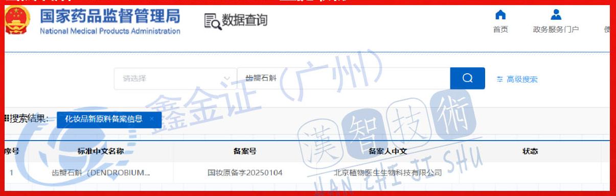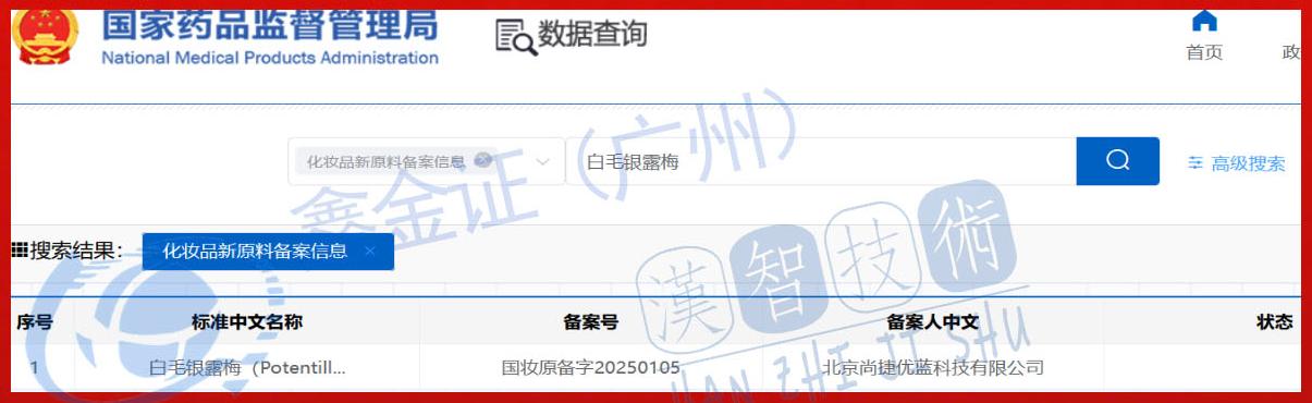 鑫金证成功助力战略合作伙伴 [北京植物医生生物科技有限公司] 的新原料 “[齿瓣石斛(DENDROBIUM DEVONIANUM )茎提取物]” 与 [北京尚捷优蓝科技有限公司] 的新原料 “[白毛银露梅(Potentilla glabra Lodd. var. mandshurica (Maxim.) Hand. -Mazz)提取物]” 双双 通过国家药品监督管理局(NMPA)化妆品新原料备案。(备案号分别为:[国妆原备字20250104]、[国妆原备字20250105])!