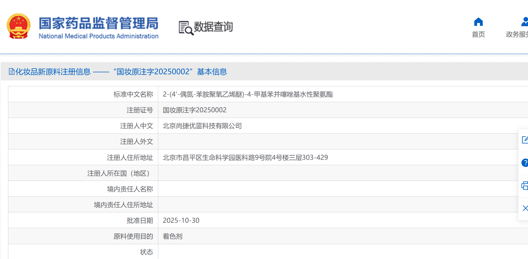 近日,我国化妆品原料领域迎来重大突破——鑫金证助力北京尚捷优蓝科技有限公司自主研发的“2-(4’-偶氮-苯胺聚氧乙烯醚)-4-甲基苯并噻唑基水性聚氨酯”(商品名:安色®洛神朱)正式通过国家药品监督管理局(NMPA)审批,成为全球首个获批用于化妆品领域的高分子着色剂。这是自2021年《化妆品新原料注册备案资料管理规定》实施以来,第二个成功获批的注册类新原料,也是第一个成功获批的注册类国产化妆品新原料,标志着我国在化妆品着色技术领域实现从“跟跑”到“领跑”的历史性跨越。
