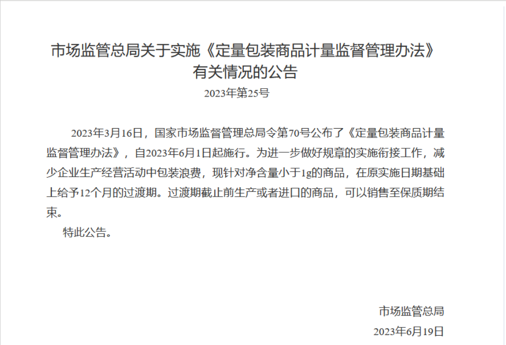 第二十一条 本办法自2023年6月1日起施行。2005年5月30日原国家质量监督检验检疫总局令第75号公布的《定量包装商品计量监督管理办法》同时废止。